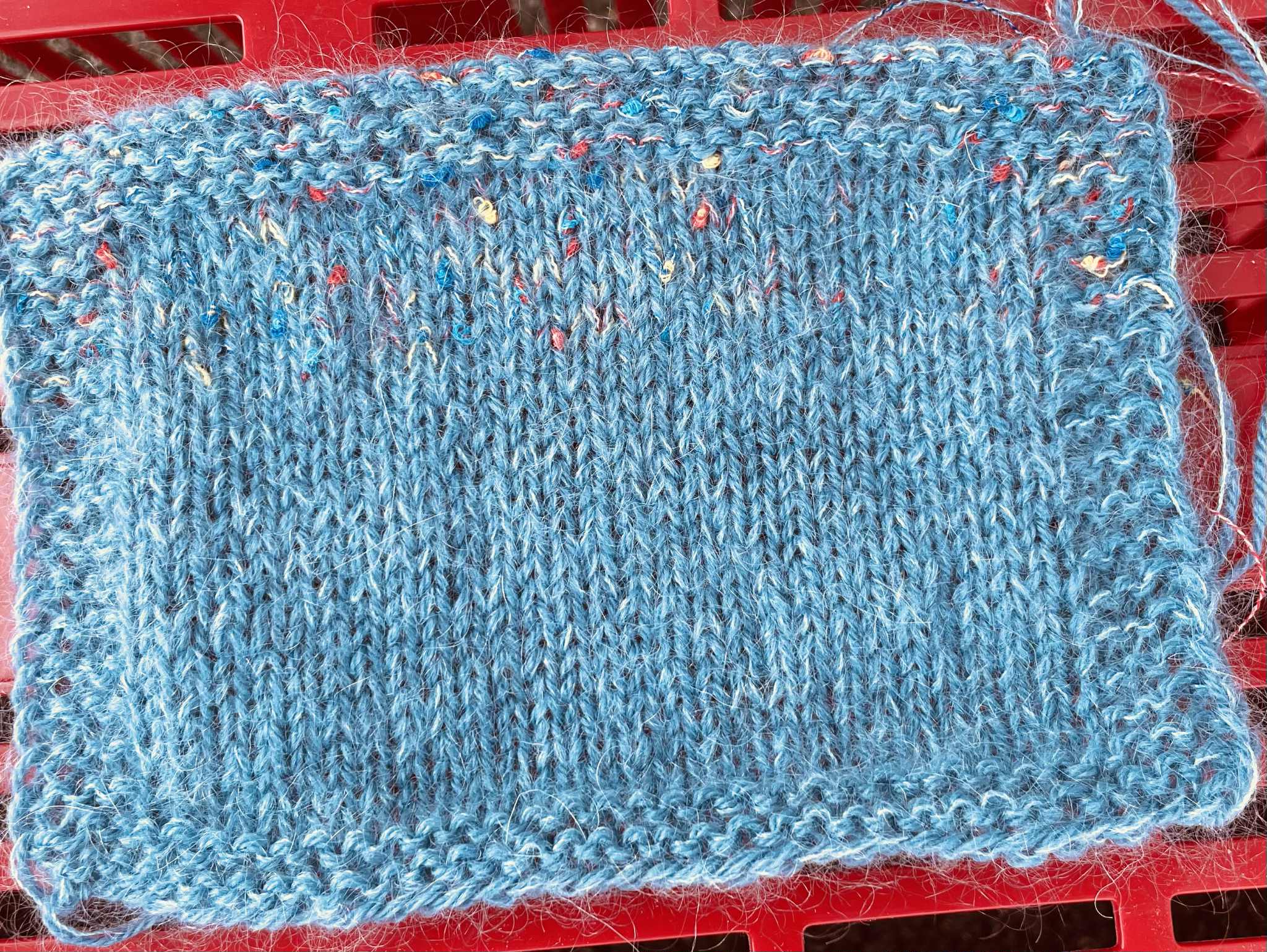 23 masker x 30 pinde i dobbeltstrik på pind 2,5 mm = 10 x 10 cm