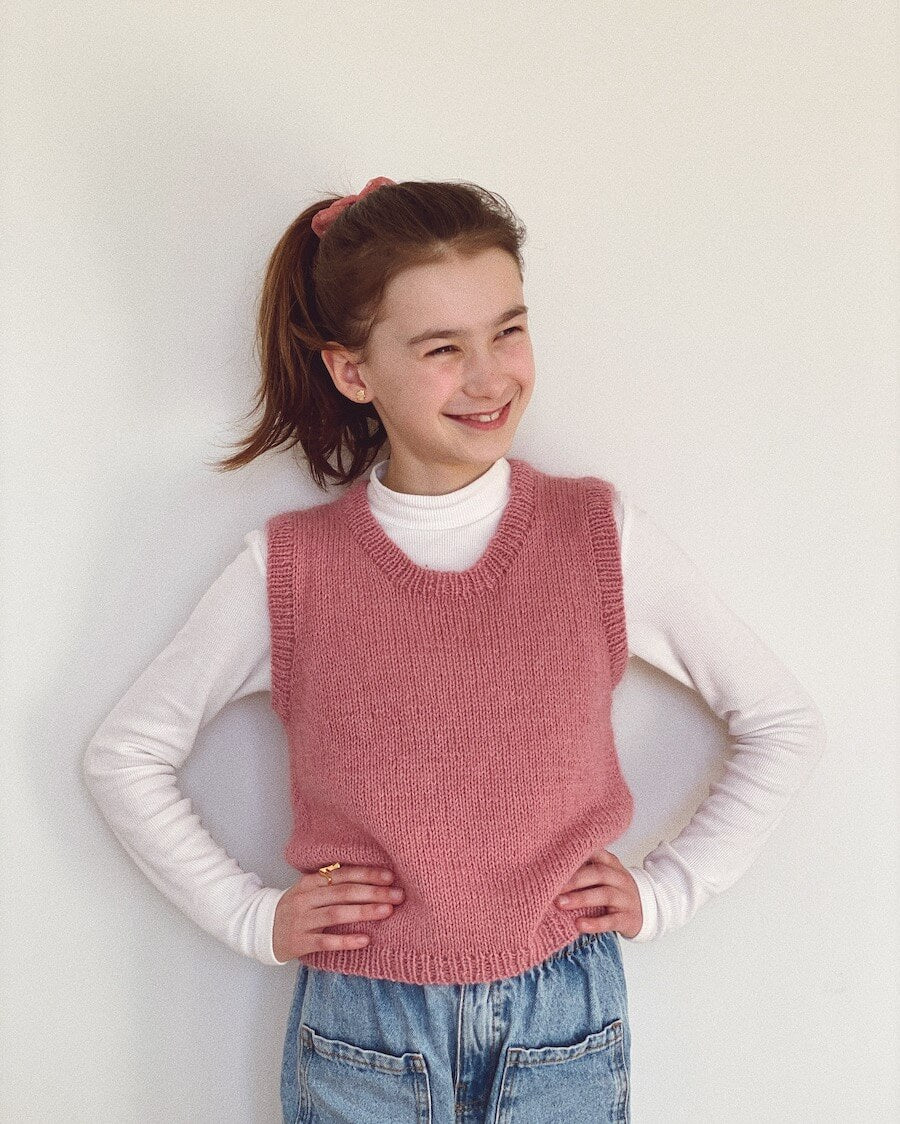 Den lyserøde Stockholm Slipover Junior er strikket i Sunday fra Sandnes Garn i farven Frozen Yogurt [4313] sammen med Tynn Silk Mohair fra Sandnes Garn i farven Rosa [4323].